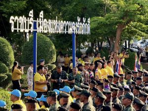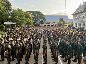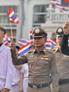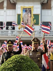 ร่วมกับส่วนราชการ ทหาร ประชาชน กลุ่มพลังมวลชน ยืนตรงเคารพธงชาติ เพื่อแสดงออกถึงความรักชาติ ความภูมิใจในความเป็นไทย และความสามัคคีของประชาชนในชาติ รำลึกถึงความกล้าหาญของวีรบุรุษไทยผู้เสียสละเพื่อปกป้องแผ่นดิน